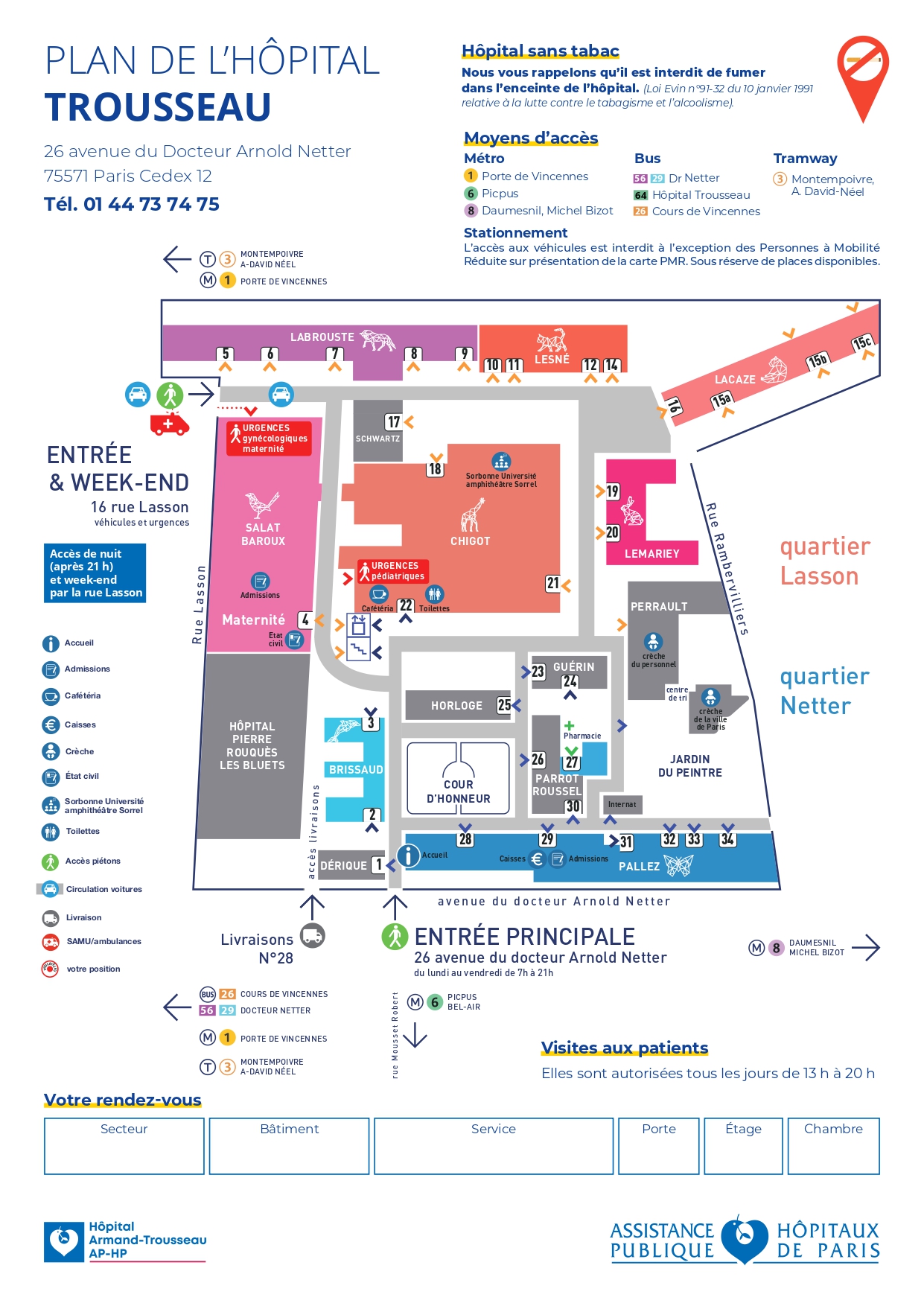 L’hôpital Trousseau est un hôpital public faisant partie de l’Assistance Publique–Hôpitaux de Paris (AP-HP), qui est le Centre Hospitalier Universitaire (CHU) de la région Ile-de-France. L’AP-HP assure des missions de soins, d’enseignement, de recherche, de prévention, d’éducation à la santé et d’aide médicale urgente. Elle couvre l’ensemble des disciplines de médecine, chirurgie, obstétrique et biologie, et accueille chaque année plus de 6 millions de patients de tous les âges.Elle propose tous les types de prise en charge : urgences, consultations, hospitalisation (de jour, de courte ou longue durée), soins de suite et de réadaptation et hospitalisation à domicile.