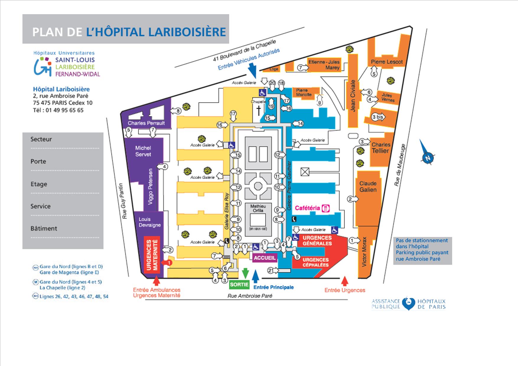 Un parc de stationnement Vinci se situe devant l’hôpital – Entrée au 2, Rue Ambroise Paré, 75010 Paris