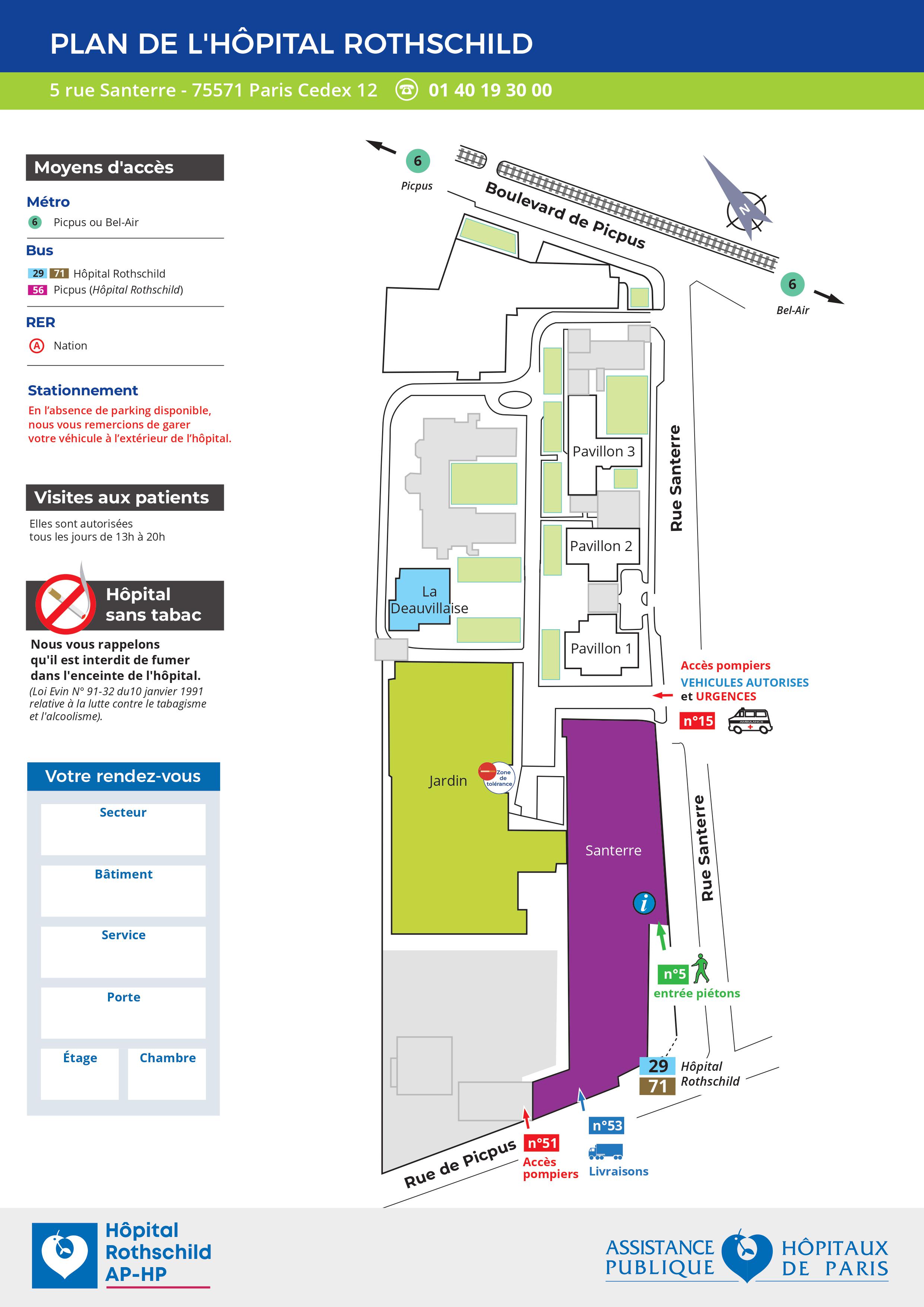 Les consultations et l’hôpital de jour sont situés au rez-de-chaussée. L’hospitalisation complète est située au 2ème étage.